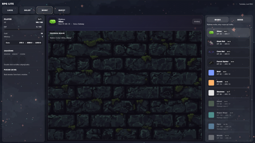 Prosta gra RPG w React z podstawowymi mechanikami rozgrywki. Obejmował implementację logiki gry, interfejsu użytkownika oraz rozwój kluczowych funkcji gameplay.